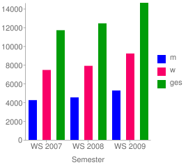 | Frage B5: Die Graphik zeigt die Anzahl der Studenten an der Universität Salzburg, über die Jahre hinweg, aufgeschlüsselt nach männlichen und weiblichen Studenten. Welche Aussage können wir aus der Graphik ablesen? | ||||||||||